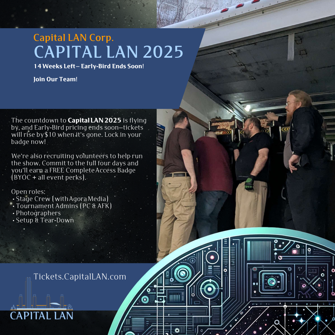 Mastric Posted April 17 Posted April 17 The countdown to Capital LAN 2025 (July 24–27) is flying by, and Early‑Bird pricing ends soon—tickets will rise by $10 when it’s gone. Lock in your badge now! We’re also recruiting volunteers to help run the show. Commit to the full four days and you’ll earn a FREE Complete Access Badge (BYOC + all event perks). Open roles: • Stage Crew (with Agora Media) • Tournament Admins (PC & AFK) • Photographers • Setup & Tear‑Down 🎟️ Tickets & add‑ons: Tickets.CapitalLAN.com 📝 Volunteer sign‑up: forms.office.com/r/33sfA5RDmj Tag your squad, spread the word, and let’s make this our best LAN yet! 🎮💪
